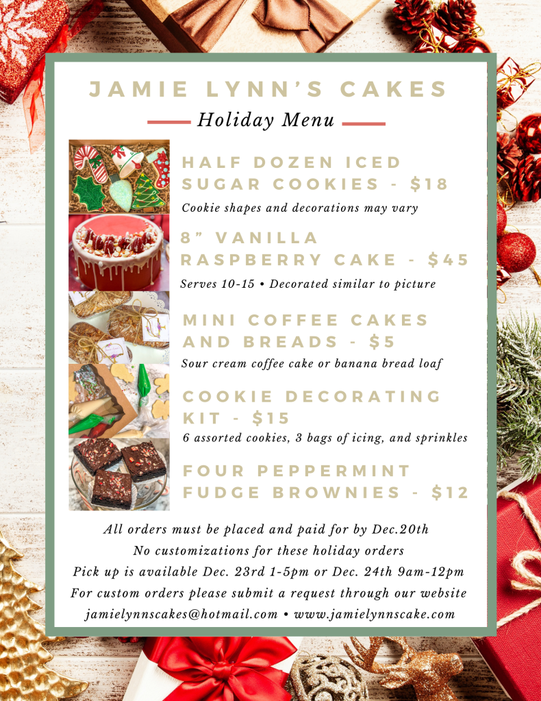 From Santa’s cookies, to Christmas morning coffee cakes, and holiday gifts, we got it all! Check out our holiday menu below for everything we’re offering this season. Don’t see what you want? You can always send us a special request through our contact page!